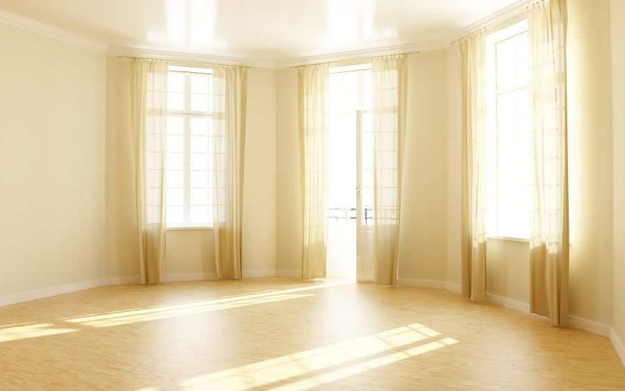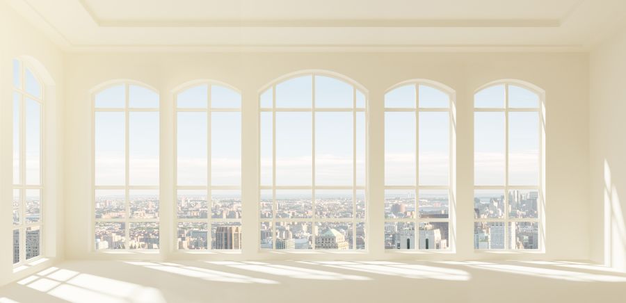 Фотошпалери Порожнє приміщення з панорамою на мегаполіс